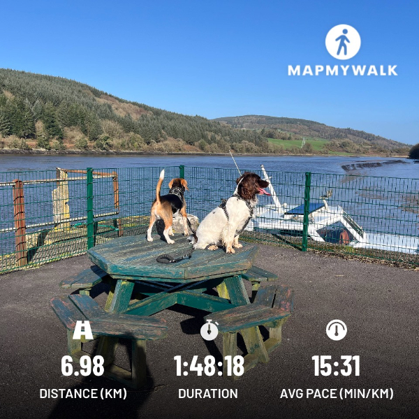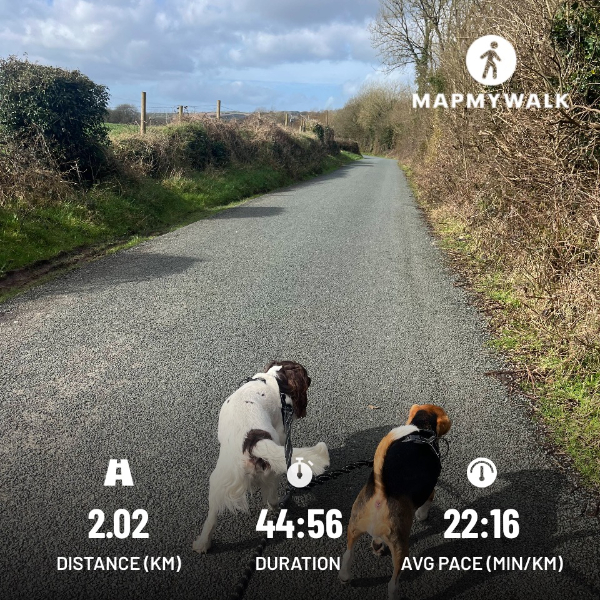 Thursday 5th Mar Went for a lovely walk today. Sun was shining and dogs really enjoyed their walk. Walked from home to Ballinaclash Quay which was roughly 7km down and back. Met plenty of farm animals and wildlife along the way. Share