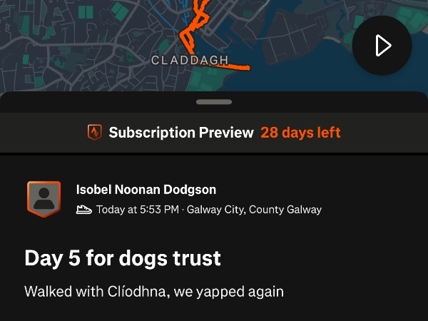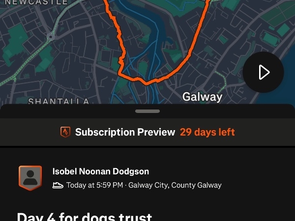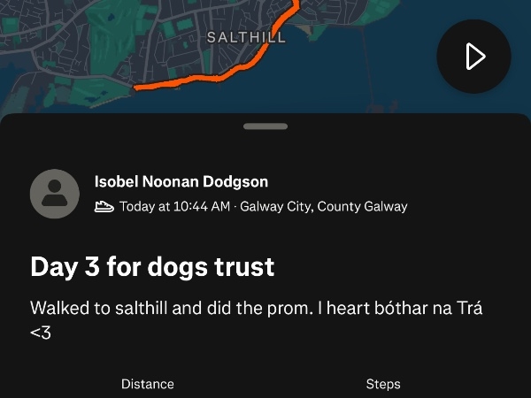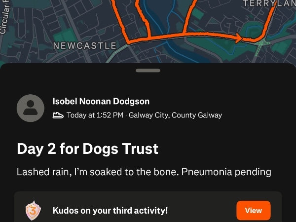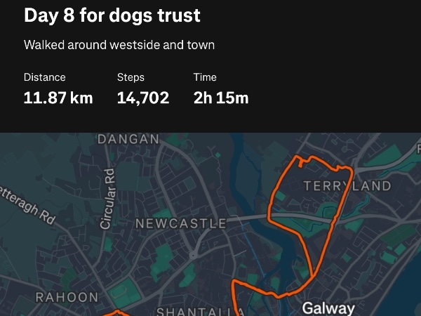 I'll be taking on a challenge of walking 99 kilometres in a month to help stray and abandoned dogs and puppies. Every euro raised gives the gift of a second chance to our furry friends in Dogs Trust Ireland's care - thank you for your support!